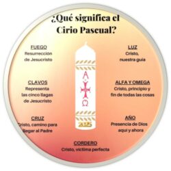 El Cirio, símbolo de la luz de Cristo, tiene una inscripción en forma de cruz, junto con las letras Alfa y Omega y la fecha del año.